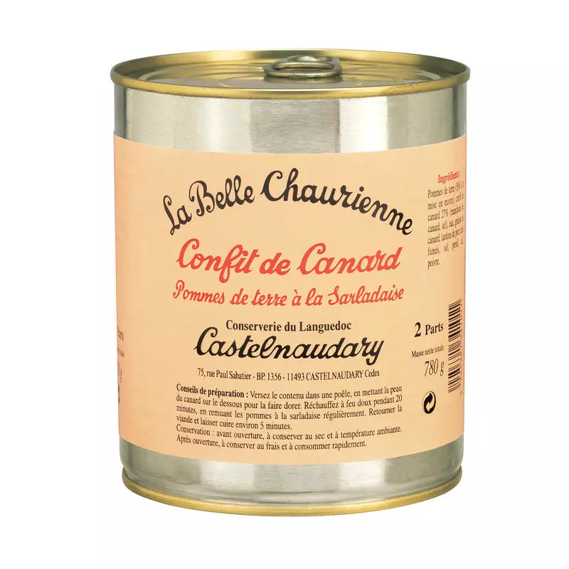 Poteter 58 %, andeconfitert 27 % (andermer EU-opprinnelse, salt), vann, andefett, røkte svinekjøttterninger (svinekjøtt